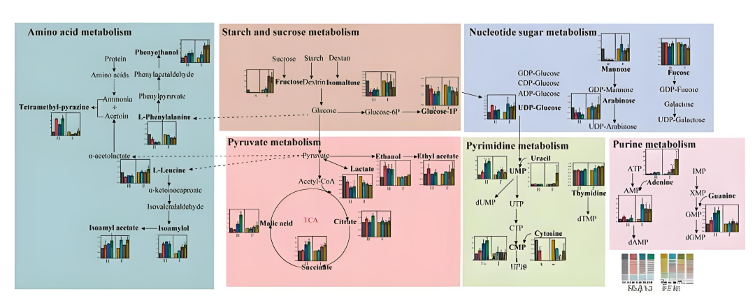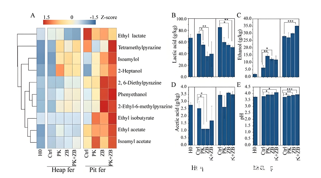 非靶向代谢组学(UHPLC-Q-TOF-MS)结合KEGG通路富集表明,乳酸降低通过增强氨基酸代谢、TCA循环和核苷酸代谢,促进了乙醇和酯类合成。差异代谢物(如甲基十六烷酸酯)与高温放线菌(Thermoactinomyces)的脂酶活性相关。此外,乳酸调控通过亚油酸代谢途径影响吡嗪类物质的生成,例如PK+ZB组中2,6-二乙基吡嗪含量从0.09 mg/kg增至0.20 mg/kg。这些代谢通路的协同作用解释了接种组风味品质提升的分子机制。