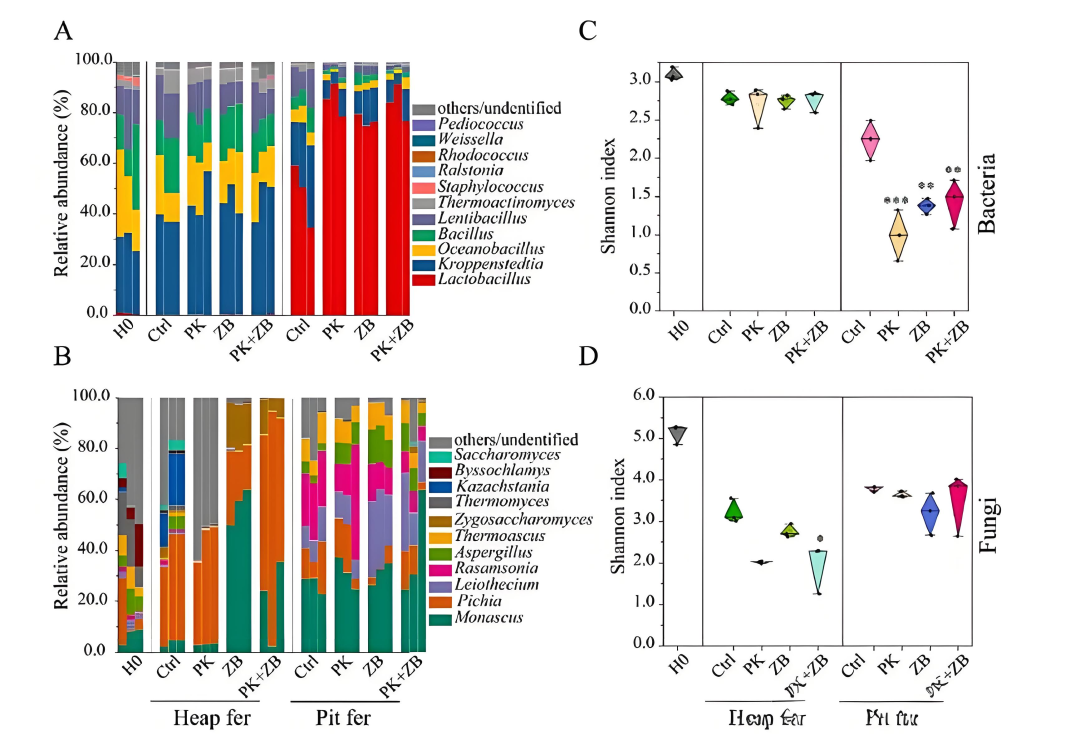 高通量测序显示,堆发酵阶段细菌群以Kroppensedtia、Oceanobacillus和Bacillus为主,窖池发酵阶段则以Lactobacillus为主导;真菌群在堆发酵阶段以Pichia和Zygosaccharomyces为主(PK+ZB组占70.1±19.5%),窖池阶段转为Leiothecium和Aspergillus。接种乳酸降解菌显著降低了窖池发酵末期细菌群落的Shannon多样性指数,但真菌多样性在堆发酵阶段因共接种而降低。群落结构的时空分异表明,乳酸调控通过改变优势菌群,如Lactobacillus丰度增加,从而影响代谢功能。