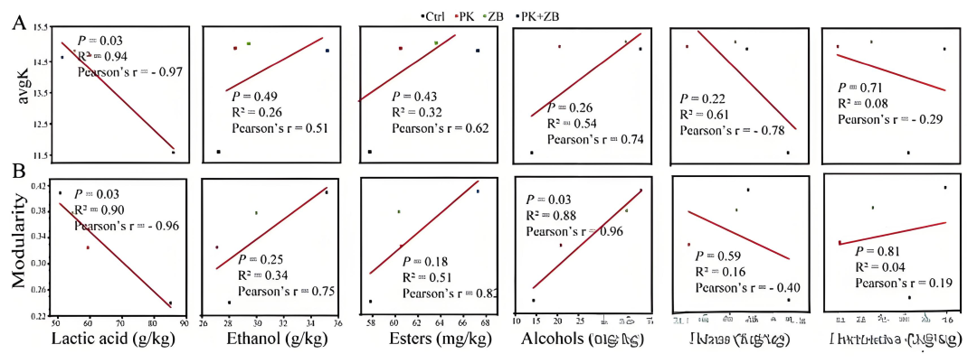 图5.生态网络的拓扑指标与其发酵性能之间的关系。