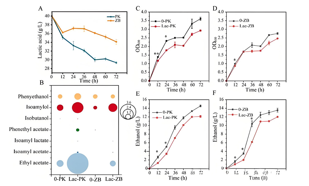 在含40 g/L乳酸的环境下,两种酵母菌表现出显著的乳酸降解能力。其中,P. kudriavzevii(PK)在发酵末期降解乳酸达10.66±0.45 g/L,而Z. bailii(ZB)降解量为5.88±0.66 g/L。乳酸胁迫对两种菌株的初期生长(OD600值)产生抑制作用,但对乙醇产量无显著影响。此外,在乳酸存在时,两种菌株合成的挥发性化合物(如乙酸乙酯、苯乙醇和异戊醇)含量显著增加,表明乳酸胁迫可能通过激活代谢通路增强其风味物质合成能力。